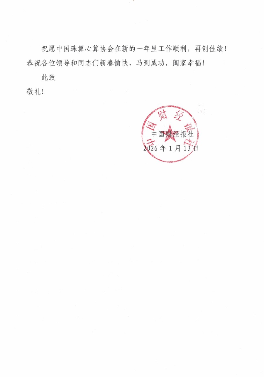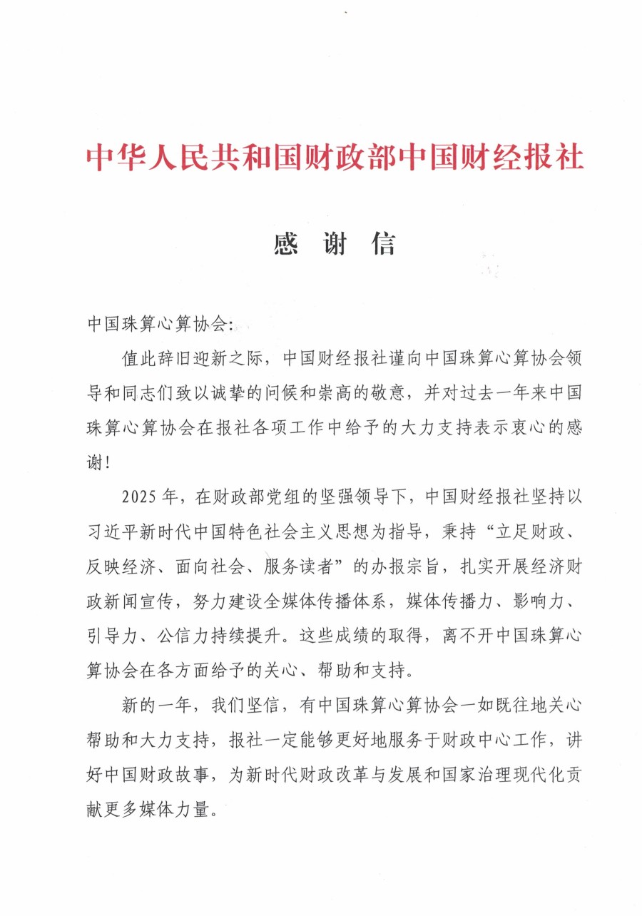 中国财经报社对中国珠算心算协会配合开展各项工作表示感谢